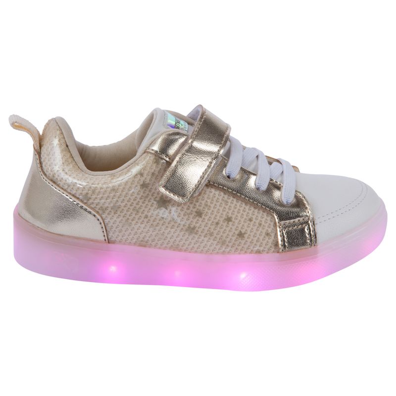 ¡Haz que cada paso brille con estilo con las zapatillas Smart Fit para niña! Este diseño dorado con acabado texturizado y luces LED rosas en la suela combina moda y diversión en un solo zapato. El práctico cierre de velcro y los cordones garantizan un ajuste seguro y cómodo, mientras que los materiales duraderos brindan soporte para el uso diario. Perfectas para actividades escolares, salidas o eventos especiales, estas zapatillas son el accesorio ideal para destacar con un toque de glamour y comodidad.